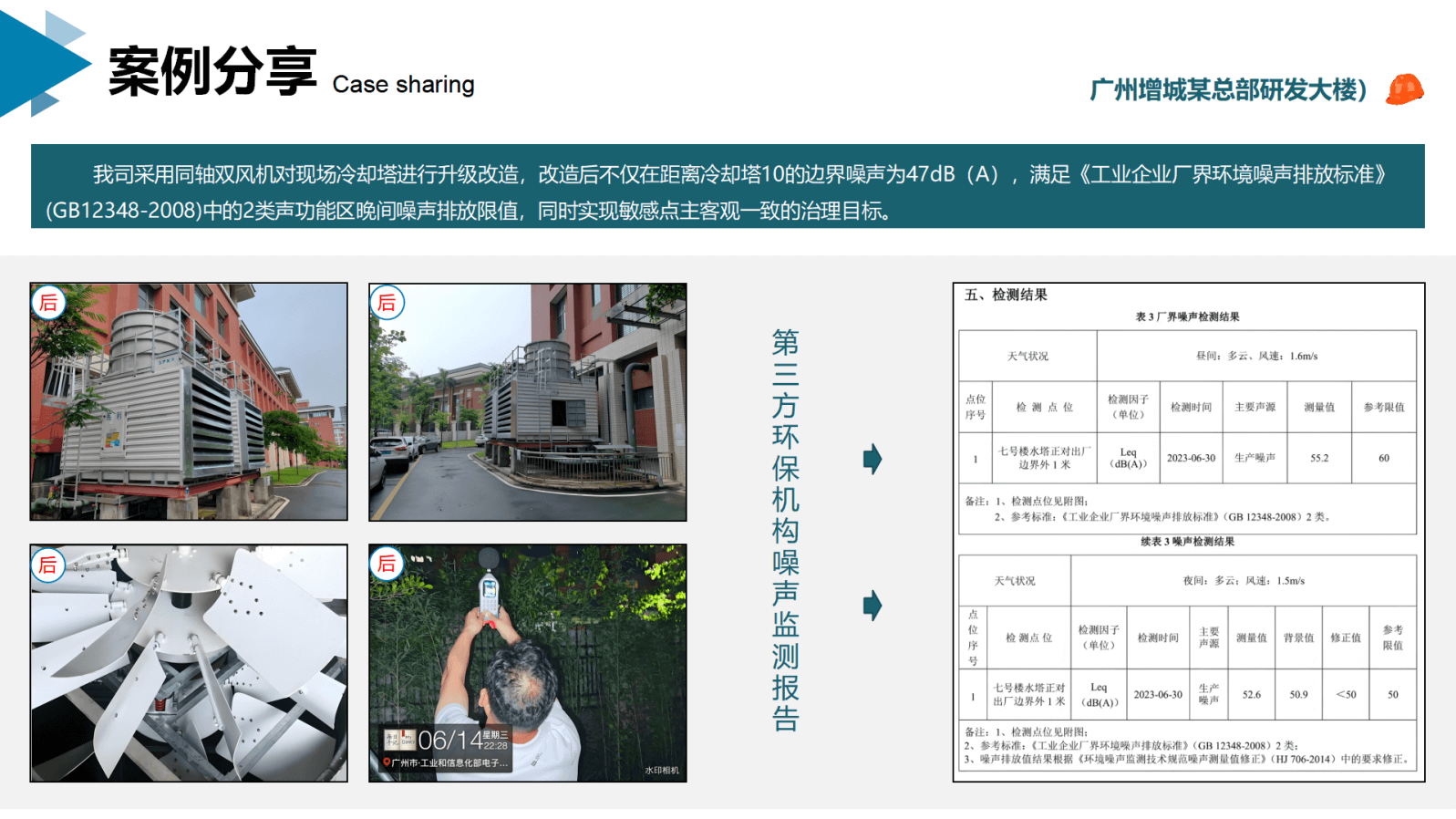 經過改造,四臺冷卻塔產生的噪聲已符合《工業企業廠界環境噪聲排放標準》(GB12348-2008)中的1類聲功能區噪聲排放限值標準。醫院方同時委托第三方聲學機構對敏感點進行噪聲測試,4臺冷卻塔工頻運行下,噪音晝間≤55dB(A)、夜間≤45dB(A)。